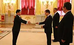 ![]() Dmitri Medvédev recibiendo las cartas credentiales de Li Yun-ho 03 de junio de 2010 en el Kremlin de Moscú | ||
