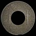 - 5 chelines de plata .903 de 1813 con agujero central, conocido como «dólar agujereado» (holly dollar en inglés, y sin denominación ni año estampado), en el anverso con contramarca circular con rayos de sol sobre un real de a ocho novohispano de la ceca de México con los años 1791 a 1808 y de un real de a ocho peruano de la ceca de Lima con los años 1808 a 1811.[3]