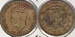 - De latón de níquel, en el anverso con rostro masculino coronado de perfil, con cabeza corta el primer año y luego larga, mirando a la izquierda, con leyenda: GEORGE VI KING AND EMPEROR OF INDIA * (Jorge VI, rey y emperador de India); en el reverso semejante a los anteriores pero en vez de viñetas presenta la fecha en dos partes, separado por el escudo, con años 1937, 1938, 1942, 1945 y 1947.