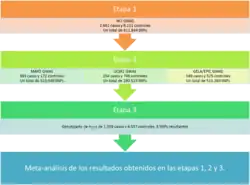 El estudio realizado por James Cerhan y colaboradores,[42] trata de determinar la susceptibilidad genética que existe para este cáncer, mediante el metaanálisis de tres estudios de asociación del genoma completo (GWAS). Para ello, se analizaron un total de 3,857 casos y 7,666 controles. Este estudio se divide en tres etapas, que podemos diferenciar en dos fases: