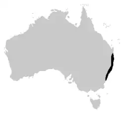 Es endémica de Australia. Habita a lo largo de la costa este del sureste de Queensland al sur de Nueva Gales del Sur. El área de distribución de la especie es de aproximadamente 73 000 km².[4]