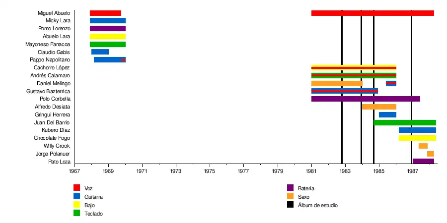 - Miguel Abuelo - voz principal y coros, percusiones (1967-1969) (1981-1988; su muerte)