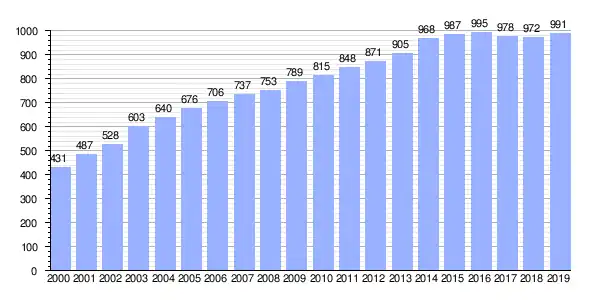 | Gráfica de evolución demográfica de Lucí (aldea) entre 2000 y 2019 |