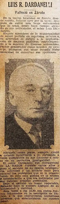 - ↑ «Notas sociales - Luis R. Dardanelli». El Debate (Zárate). 14 de octubre de 1928.