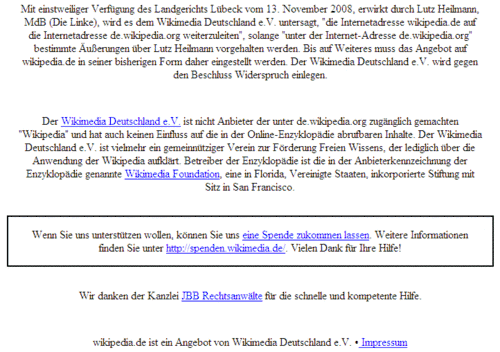 - ↑ «Wikipedia: Einstiegsseite wegen Klage blockiert». Focus Online (en alemán). 15 de noviembre de 2008. Consultado el 15 de noviembre de 2008.