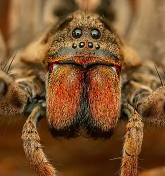 Como en otros integrantes del género Lycosa, L. erythrognatha presenta 8 ojos en 3 filas, la fila inferior posee 4 pequeños; algo más arriba se presenta la segunda, con 2 grandes ojos; finalmente la última posee también 2, pero más pequeños y ubicados más hacia los lados en la parte horizontal del rostro. Las patas son largas y espinosas, siendo las más cortas las del primer y tercer par y la más largas las del cuarto par; los tarsos poseen densas escópulas y terminan en 3 uñas; además, no cuenta con fascículos subungueales.[9]