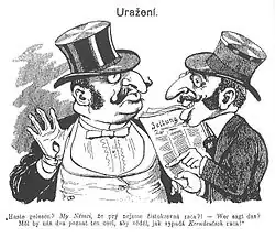El erudito británico Nikolaus Pevsner fue descrito como "más alemán que los alemanes" por su apoyo al programa de Goebbels para el "arte alemán puro no decadente" y se informó que dijo sobre los nazis en 1933: "Quiero que este movimiento tenga éxito. No hay más alternativa que el caos... hay cosas peores que el hitlerismo ".[10] La judía alemana Betty Lipton describió la identidad judío-alemana después de la emancipación en En casa en Berlín. Escribió que su familia tenía un hogar kosher, asistía a la sinagoga y era parte de la comunidad judía muy unida de Berlín. Simultáneamente, su familia fue leal a Alemania. En 1914, desplegaron la bandera negra, blanca y roja más grande de toda su calle.[11] Este breve relato explica por qué las familias judías se describían a menudo como "más alemanas que los alemanes".