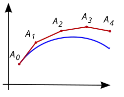 Ahora, dando un pequeño paso sobre dicha recta, podemos tomarnos un nuevo punto A1 y suponer que dicho punto pertenece a la curva, entonces seguimos el mismo razonamiento aplicado anteriormente y volvemos a calcular la pendiente de la recta tangente a la curva en el punto A1. Luego de varios pasos tendremos formada una curva poligonal A0A1A2A3... En general esta curva que obtenemos al aplicar el método no diverge lejos de la curva original, además el error entre ambas curvas se puede minimizar si se dan pasos muy pequeños al avanzar sobre la recta tangente a la curva y además el intervalo sobre el que trabajamos es finito (aunque las cosas son más complicadas para ecuaciones inestables, como se discute más abajo)...