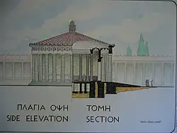 El conjunto, que data entre el I y el II siglo d. C., de considerable tamaño, con una longitud total de 75 metros y una anchura de casi 60, se parece a un patio cuadrado, rodeado por un porche el cual pasaba por lo alto de las tiendas; dos baños públicos están situados en los lados del ábside de la parte inferior, mientras que los restos de las escaleras que conducen a la planta superior del pórtico se conservan en ambos lados, que daba al puerto; por último, en el centro del patio hay un edificio circular elevado, una vez rodeado de columnas, tal vez cubiertos por una cúpula o techo cónico, llamada tholos, en la que se podía subir al podio con cuatro escaleras dispuestas en cruz.