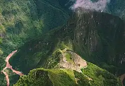 Machu Picchu (en quechua, Machu Pikchu 'monte o pico viejo', pronunciado [ˈmɐt͡ʃʊ ˈpɪkt͡ʃʊ]) es el nombre contemporáneo que se da a una llacta (antiguo poblado incaico) construida antes del siglo XV, en la cordillera Oriental del sur del Perú, en la cadena montañosa de los Andes a 2,430 metros sobre el nivel del mar.[3][4] Está en el departamento del Cusco (provincia de Urubamba, distrito de Machupicchu) sobre el Valle Sagrado de los Incas,[5][6][7] a 80 kilómetros al noroeste del Cusco, ciudad del Perú y por donde fluye el río Urubamba,[8][9] río que atraviesa la cordillera y origina un cañón con clima de montaña tropical. Forma parte de un área de conservación arqueológica y ecológica del mismo nombre.[1][2] Según muchos estudios, su nombre original habría sido Llaqtapata[10] o Patallaqta.[11]