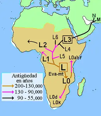- ↑ van Oven M, Kayser M. 2009. PhyloTree.org - mtDNA subtree L Archivado el 27 de julio de 2011 en Wayback Machine. doi:10.1002/humu.20921