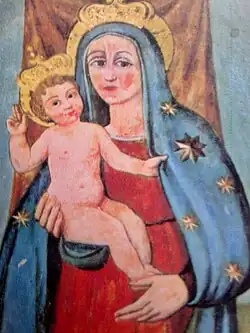 La Madona figura de pie, vestida con una túnica roja y un manto azul estrellado; sujeta al Niño Jesús con su brazo derecho mientras este apoya la planta de su pie izquierdo en la mano izquierda de la Virgen. El Niño aparece desnudo y bendiciendo con su mano derecha a la vez que gentilmente sujeta el dobladillo del manto de su madre con la mano izquierda. Tras la coronación de 1838, se añadieron dos diademas doradas.[17]