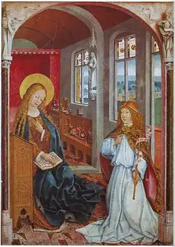 La pintura de la Anunciación representa un apartamento doble, la habitación de frente es representada como una zona de oración y el otro un dormitorio. Las ventanas dan paso a un paisaje. La Virgen, con un manto azul sobre una túnica de brocado de oro, está en su reclinatorio mirando hacia el ángel, quién, con una vestimenta lujosa y aguantando en su mano izquierda un cetro, le entrega su saludo. Del grupo de la Natividad, aún quedan cinco ángeles, quiénes se arrodillan en la tierra alrededor del Niño Jesús..
