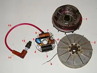 1 - Volante de inercia de la motosierra (con dos pares de imanes permanentes) 2 - Disco del volante de la motosierra (con el ventilador centrífugo de la cuchilla) 3 - Bobina primaria (generador de baja tensión) 4 - Marca para el ajuste del ángulo de avance del encendido 5 - Condensador 6 - Bobina secundaria (transformador de alta tensión) 7 - Bobina de control del circuito interruptor electrónico 8 - Circuito interruptor electrónico (integrado en resina epoxi) 9 - Cable del apagado: puesto en contacto con la "masa", detiene el motor 10 - Cable de alta tensión 11 - Pipeta de la bujía 12 - Bujía.