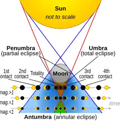 En un eclipse solar anular, la magnitud del eclipse es la relación entre los diámetros angulares aparentes de la Luna y la del Sol durante el eclipse máximo, lo que arroja una relación inferior a 1,0. Como la magnitud del eclipse es menor que uno, el disco de la Luna no puede cubrir completamente al Sol. Cuando los centros de los dos discos están lo suficientemente alineados, un anillo de luz solar permanece visible alrededor de la Luna. Esto se llama eclipse anular, del latín annulus, que significa "anillo".[3]
