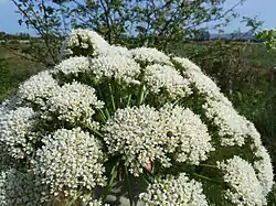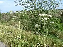 Es una hierba perenne, –a veces monocárpica–, muy robusta. Tallos 1-1,5(2,5) m, erectos, ramificados en la parte superior, estriados, cubiertos de pelos finos, suaves. Hojas basales 20-50 cm, indivisas o 1 vez pinnatisectas, con tomento denso –gris– en el envés cuando son jóvenes, con 3-7(9) lóbulos ovados, crenado- denticulados, obtusos, algunos decurrentes sobre el nervio medio; hojas caulinares con (3)5-7(9) lóbulos, de ordinario menores que las hojas basales; las superiores a menudo reducidas a un pecíolo hinchado. Umbelas con 20-40(50) radios, pubescentes. Brácteas 5-16, de 30-60 mm, linear-lanceoladas, a veces laciniadas o dentadas en el ápice. Bractéolas 8-18, de 15-25 mm, semejantes a las brácteas, reflejas, con margen escarioso. Cáliz con dientes de 0,5-1 mm. Pétalos vilosos, sobre todo, en la cara externa. Estilos 1,9-5 mm, glabrescentes. Frutos 6,5-9,5 � 3-5 mm, densamente tomentosos. Tiene un número de cromosomas de 2n = 22.[2]