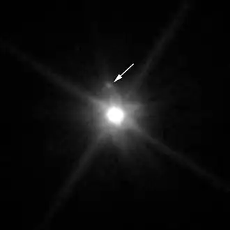 ![]() Makemake y su satélite (indicado por la flecha) vistos por el telescopio espacial Hubble | ||