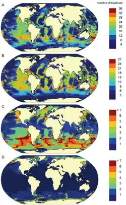 Los mamíferos marinos tienen una amplia distribución en todo el mundo, pero esta distribución es irregular y coincide con las regiones más productivas de los océanos. Logran su pico de diversidad a latitudes cercanas al paralelo 40, tanto al hemisferio norte como el hemisferio sur, que corresponden a los niveles más altos de producción primaria alrededor de las Américas, África, Asia y Australia. La distribución total varía mucho de una especie a la otra. En general, la mayoría de mamíferos marinos tienen un ámbito de distribución igual o más pequeño que una quinta parte del océano Índico.[28] Esta variación en la medida del ámbito de distribución es debida a las diferentes necesidades ecológicas de cada especie y su capacidad de enfrentarse a un amplio abanico de condiciones ambientales. El alto grado de coincidencia entre las regiones de mayor diversidad de mamíferos marinos y las partes del mundo más afectadas por el impacto de los seres humanos sobre el medio ambiente es motivo de preocupación.[29]
