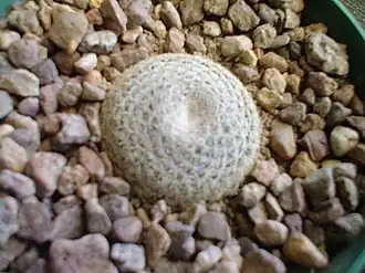 Pequeño cactus (alrededor de 6 cm de diámetro) de forma globosa o discoidal con el ápice deprimido que se divide dicotómicamente formando densas masas. Las areolas tienen alrededor de 6 mm con las axilas lanosas o desnudas y espinas cortas de color blanco. Las pequeñas flores de color blanco surgen de las axilas de las areolas.[3]
