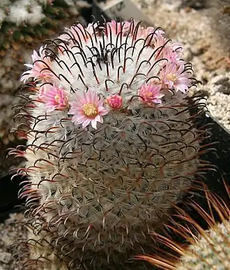 Mammillaria: nombre genérico que fue descrita por vez primera por Carolus Linnaeus como Cactus mammillaris en 1753, nombre derivado del latín mammilla = tubérculo, en alusión a los tubérculos que son una de las características del género.