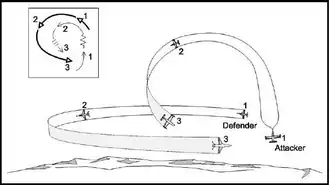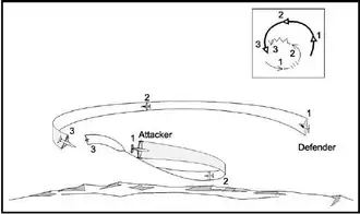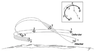 Una posición defensiva suele darse cuando el piloto detecta tarde al atacante. Normalmente, el piloto se encuentra en una posición débil, por debajo o por delante del oponente, y su principal objetivo es impedir que este dispare y pasar a una posición neutral. El objetivo secundario es escapar o alcanzar una posición dominante. Si el atacante se encuentra en desventaja en cuanto a energía, es probable que el defensor utilice la velocidad para desengancharse, pero si el atacante se mueve mucho más rápido, el defensor normalmente maniobrará para forzar un adelantamiento peligroso. Un adelantamiento peligroso se produce cuando un atacante vuela por delante del defensor, provocando que se inviertan sus roles.[40] El cierre se produce durante la persecución en cabeza y luego se invierte durante la persecución en cola, con la mayor separación entre la nariz y la cola en el momento en que el atacante toma la delantera.]] Una vez que un atacante se coloca detrás de un defensor, hay tres problemas que resolver para llevar a cabo la maniobra. El atacante debe ser capaz de situarse en el mismo plano geométrico que el defensor, entrar en el alcance sin sobrepasar el objetivo y ser capaz de adelantarse a él. El defensor normalmente girará agresivamente para estropear la solución del atacante.[24]