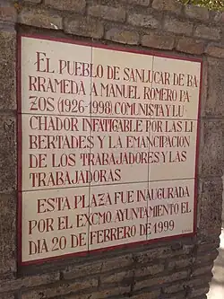 En el año 1999 el Ayuntamiento de Sanlúcar de Barrameda, siendo alcalde Agustín Cuevas Batista (PSOE), le rindió homenaje tras su fallecimiento otorgando su nombre a una plaza (antigua Plaza de la cárcel) en el municipio gaditano.