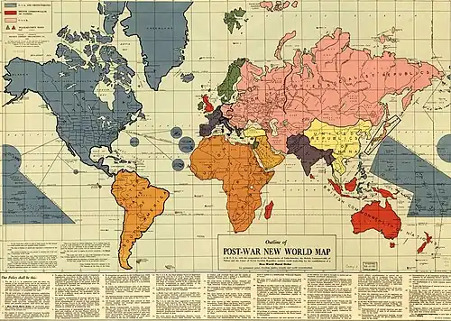 El mapa propone que las Célebes, Hainan, Islandia, las islas Molucas, Filipinas y Taiwán sean protectorados estadounidenses. Así mismo, las ciudades portuarias de Dakar y Freetown (en la costa oeste de África) y las islas del Pacífico (excepto Islas Salomón y Nueva Guinea) serán "bases de paz y seguridad".