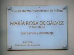 - ↑ 20minutos (16 de junio de 2014). «El Ayuntamiento de Málaga homenajea a la escritora María Rosa de Gálvez con una placa en La Merced». www.20minutos.es - Últimas Noticias. Consultado el 25 de junio de 2024.