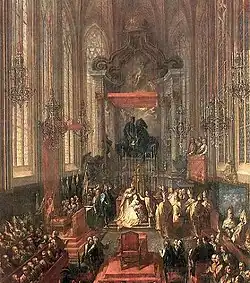 Contra todo pronóstico, María Teresa recibió un apoyo significativo desde Hungría. (Browning, 1995, p. 66) Su coronación como «rey» de los húngaros se produjo en la catedral de San Martín en Bratislava el 25 de junio de 1741, tras meses negociando con la Dieta y perfeccionando sus habilidades como amazona, necesarias para la ceremonia.[Nota 9] En julio, los intentos de conciliación se habían desmoronado totalmente. El elector de Sajonia, antiguo aliado de María Teresa, se convirtió en su enemigo (Crankshaw, 1969, p. 75) y Jorge II de Gran Bretaña declaró la neutralidad del elector de Hanóver. (Crankshaw, 1969, p. 77) Una vez más, la soberana necesitaba la ayuda de Hungría y, para obtenerla, concedió favores a los nobles húngaros, adulándolos sin atender a la totalidad de sus exigencias. Ya había logrado su apoyo anteriormente, cuando llegó a Bratislava en septiembre de 1741, con la esperanza de persuadir a la Dieta para que se convocase y reconociera a Francisco Esteban como corregente. Al alcanzar sus objetivos, demostró sus dones teatrales abrazando triunfalmente a su hijo y heredero José ante la Dieta, con lo que consiguió la simpatía de los nobles. (Browning, 1995, p. 67)(Mahan, 2007, p. 122)(Morris, 2007, p. 74)