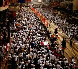 En 2003, a raíz del proyecto de ley de seguridad nacional (disposiciones legislativas) de 2003, que alteraban el artículo 23 de la Ley Básica de Hong Kong (derecho a la libertad de expresión), el seguimiento de la marcha del 1 de julio de aquel año fue masivo (la ley se votaba el 9 de julio). Originalmente, los nuevos organizadores, el Frente Civil de los Derechos Humanos, esperaban en torno a 20 000 manifestantes, las cifras de seguimiento oscilan entre 350 000 manifestantes (según la policía), los 700 000 (según organizadores) y los 500 000-1 000 000 (según prensa).[1] El ejecutivo hongkonés se comprometió a modificar las disposiciones legislativas tras la presión.[3]
