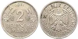 | 2 Marcos | 1951 | Cuproníquel (hasta 1969), Cuproníquel depositado en níquel | 25,50 | 7,00 | Escudo de armas alemán (Bundesadler) | Valor facial entre dos espigas de trigo y racimos de uvas | |