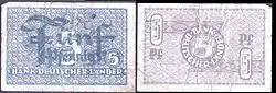 | 5 Pfennig | 1948-1949 | Latón depositado en acero | 18,50 | 3,00 | Rama de roble (Quercus robur) | Valor facial entre espigas de trigo | |