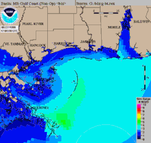 El Centro Nacional de Huracanes pronostica inicios de tormentas usando el modelo SLOSH, acrónimo de Sea, Lake and Overland Surges from Hurricanes, que significa surgimientos o marejadas marinas, lacustres y terrestres debidas a huracanes. El modelo ajusta dentro de un 20 %.[1] Las entradas de SLOSH incluye la presión central de un ciclón tropical, tamaño de la tormenta, el movimiento hacia adelante del ciclón, su trayectoria, vientos máximos sostenidos. La topografía local, orientación de bahías y ríos, profundidad del fondo del mar, mareas astronómicas, como todo otro asunto físico se toman en cuenta, en una predefinida grilla referida a una base SLOSH. El solapamiento de las funciones SLOSH se define para las líneas costeras sur y este del Estados Unidos continental.[2] Algunas simulaciones de tormentas usan más de un SLOSH; por ej., el modelo SLOSH de Katrina corre usando ambas bases del lago Pontchartrain en Nueva Orleans, y el seno de Misisipi, para las tierras al norte del golfo de México. La salida final de la corrida del modelo despliega el producto MEOW (Maximum Envelope of Water), es decir, la expansión máxima del agua que ocurre en cada localidad. Para controlar las incertidumbres de trayectoria y de pronóstico, se suelen correr varios modelos con distintos parámetros de entrada para generar una carta denominada MOM (Maximum of Maximums o Maximum of MEOW, es decir, máximo de máximos o máximo de MEOW).[3] Y para estudios de evacuación de huracanes, se modela una familia de tormentas con trayectorias representativas de la región, variando los factores tales como la intensidad, el diámetro de ojo y la velocidad para producir los niveles de agua máximos posibles en un ciclón tropical. Los resultados de tales estudios suelen generarse a partir de varios miles de ciclos de ejecución de SLOSH. El Cuerpo de Ingenieros del Ejército de los Estados Unidos (USACE) ha completado estos estudios para varios Estados y están disponibles en el sitio web de estudios de evacuación de huracanes (Hurricane Evacuation Study, HES).[4] Incluyen cartas costeras del país, sombreadas para identificar las mínimas categorías SSHS de huracanes que resultarán en inundaciones, en cada área del país.[5]