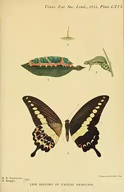 - Fountaine, M. E. 1915. XIV. Notes on the life history of Papilio demolion, Cram. Transactions of the Royal Entomological Society of London 62(3‐4): 456–458. https://dx.doi.org/10.1111/j.1365-2311.1915.tb02986.x