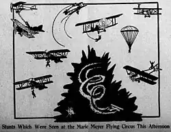 Marie Meyer actuó como piloto, caminante sobre alas y paracaidista.[2][5] Las acrobacias que realizó incluyeron pararse en el ala superior del biplano mientras giraba, a veces mientras sostenía una cuerda y, a veces, con los pies metidos en los estribos para poder saludar a la audiencia.[3] Otro truco fue saltar desde el ala inferior del avión usando un paracaídas.[3][12][13] Meyer también contrató a Elbert «Bertie» Brooks, un trapecista, para que actuara colgado debajo del avión.[2]
