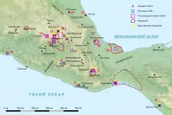 - La Alcaldía Mayor de los cuatro pueblos del marquesado: Santa María de Oaxaca, Cuilapan, Etla y Santa Ana Tlapacoyan, de 1.500 km²,[17]> incluyó 34 pueblos, 2 haciendas y un ingenio azucarero. A pesar de estar rodeado de tierras de esta Alcaldía, la ciudad de Antequera, hoy Oaxaca de Juárez, era patrimonio de la Corona, no del marqués.