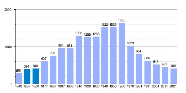 | Gráfica de evolución demográfica de Martín de Yeltes[18] entre 1842 y 2021 |