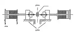 La masa no está estable sobre el yunque sino entre las masas móviles de dos martillos iguales de aire comprimido y eje horizontal.
