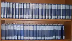 Los 39 volúmenes principales del MEW aparecieron entre 1956 y 1968, fueron seguidos en 1967 y 1968 por dos volúmenes suplementarios (vols. 40 y 41) con escritos, manuscritos y cartas de Marx y Engels del período hasta el que se había publicado anteriormente. omitido en los volúmenes 1 y 27 de la edición de 1844, en 1983 también hubo un volumen con los “ Grundrisse” de Marx (Vol. 42), y en 1990 y 2018, respectivamente, dos volúmenes con el manuscrito económico de Marx de los años 1861–1863 (vol. 43 y 44). La edición también incluye dos volúmenes de directorio y un volumen de índice.[8]