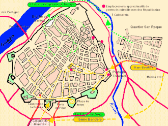 La ocupación de Badajoz formó parte del avance desde Andalucía del ejército sublevado hacia el norte de la península. Su asalto era vital para ellos, pues significaba la unión del ejército del sur con el del general Mola que dominaba el norte. La ciudad se encontraba aislada tras la caída de Mérida unos días antes. El asedio fue llevado a cabo por 2250 legionarios, 750 regulares marroquíes, y cinco baterías de artillería, al mando del entonces teniente coronel Juan Yagüe. El ataque final se produjo la tarde del 14 de agosto, tras bombardear la ciudad por tierra (a través de la artillería) y aire (mediante bombarderos trimotor, probablemente Savoia-Marchetti S.M.81 italianos) durante la mayor parte del día. El recinto amurallado era defendido por unos 3000 milicianos republicanos y 500 soldados, al mando del coronel Ildefonso Puigdengolas. Tras abrir una brecha en las murallas por el este, junto a la Puerta de la Trinidad, y lograr el acceso también a la alcazaba, por la Puerta de Carros, se produjo una encarnizada lucha cuerpo a cuerpo, y la ciudad cayó en manos del ejército sublevado.[23]