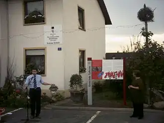 Inauguración de la placa informativa el 26 de julio de 2008; a la izquierda, el alcalde de Talheim, Rainer Gräßle, a la derecha, la Directora de una Exposición sobre la Masacre de Talheim. | ||