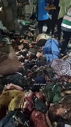 Debido al impacto de los cohetes, se inició un incendio que causó varias víctimas más, entre ellas algunas que sobrevivieron a la explosión inicial pero quedaron atrapadas entre los escombros. Los equipos de rescate que llegaron al lugar e intentaron apagar el incendio no pudieron liberar a varias de las personas atrapadas bajo los escombros antes de que el humo y el fuego se extendieran y afectaran a familias enteras. Los intentos de los equipos de rescate y otros civiles de reducir la propagación del incendio y salvar las vidas de los civiles atrapados se vieron gravemente obstaculizados debido a que el ejército israelí cortó el suministro de agua de la región.[10]