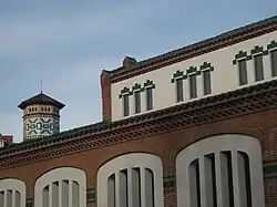 La cubierta, con las tejas vidriadas de colores, es a dos aguas con la parte central más altura permitiendo la entrada de luz cenital y la ventilación. En el interior las paredes estaban protegidas con un zócalo de cerámica vidriada utilizada también como ornamento en las ventanas. En el exterior la estructura se refleja en las fachadas con unas pilastras y arcos de obra vista con ventanas de vitrales de colores (amarillo y rosado).