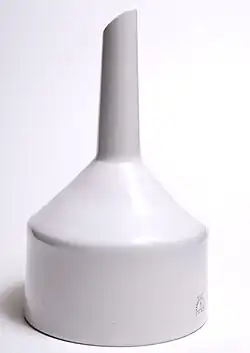 - Embudo Büchner: Se utiliza para realizar filtraciones. Tradicionalmente el embudo es de porcelana pero también existen en plástico para abaratar costes. Para realizar la filtración es necesario colocar el papel filtro del tamaño adecuado al embudo. Se puede realizar filtración por gravedad o mediante el proceso del vació mediante la ayuda de una bomba de succión, un matraz de kitasato y complementos de goma para garantizar el vacío.