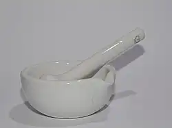- Mortero (utensilio) y mano de mortero: Es un utensilio usado desde antiguo en boticas, farmacias y laboratorios para machacar distintas sustancias u otras. También está presente en la cocina tradicional para majar alimentos.
