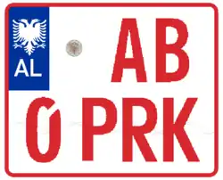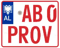 Las placas de matrícula del vehículo de prueba en Albania tienen bordes rojos y textos rojos sobre un fondo blanco. Siguen el formato [AA 0 PROV], donde PROV significa Provë que significa Prueba.