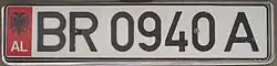 Desde el 16 de febrero de 2011 se ha introducido un nuevo formato similar a los diseños de placas italianos posteriores a 1994 y franceses posteriores a 2009.[1] Las placas comienzan con una franja azul a la izquierda con 'AL' y águila bicéfala rediseñada en blanco, 2 letras seriales, holograma de seguridad, 3 dígitos, 2 letras seriales sobre un fondo blanco rectangular, y terminan en el a la derecha con una franja azul que se supone que muestra el año de registro y el código regional en blanco. Se ha observado que los dos últimos elementos de identificación no están incluidos de facto, mientras que la fuente está más enfatizada que la posterior a 2002.[2] Plates of all vehicles would experience a similar change.[3] Los críticos afirman que el color del águila bicéfala y la franja no son representativos de los colores rojo y negro de la bandera albanesa. Las placas de vehículos privados tienen bordes negros y textos negros sobre un fondo blanco. Siguen un formato [AB 123 FG]. Este formato es nacional, independientemente del distrito de matriculación del vehículo.