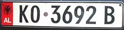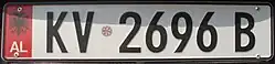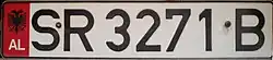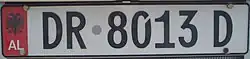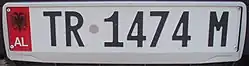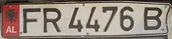 En Albania, las placas de matrícula "repetitivas" tienen bordes rojos y textos sobre un fondo blanco. Estas son placas de matrícula adicionales para instalar, si hay un objeto como un portabicicletas bloqueando la placa de matrícula original de un vehículo privado.