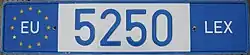 - Las matrículas de los vehículos de la EULEX pueden tener un fondo blanco o negro. En el primer caso, la numeración progresiva va precedida del círculo de las doce estrellas amarillas de la Unión Europea (no siempre presentes y a veces en una franja azul), las letras EU en color blanco, seguidas de un número de 3-4 cifras y de las letras PV (Personal Vehicle) o P (Personnel), también blancas. En el segundo caso, las letras EU de color blanco rodeadas por las doce estrellas amarillas símbolo de la UE dentro de una franja azul preceden a cuatro cifras azules y a las letras LEX en blanco en el centro de otra franja azul situada a la derecha.