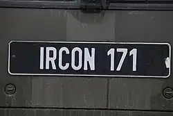 - Vehículos del contingente irlandés de la KFOR: los caracteres son de color gris plateado sobre fondo negro; las letras IRCON, que significan Irish Contingent, preceden a una numeración progresiva generalmente de tres cifras.